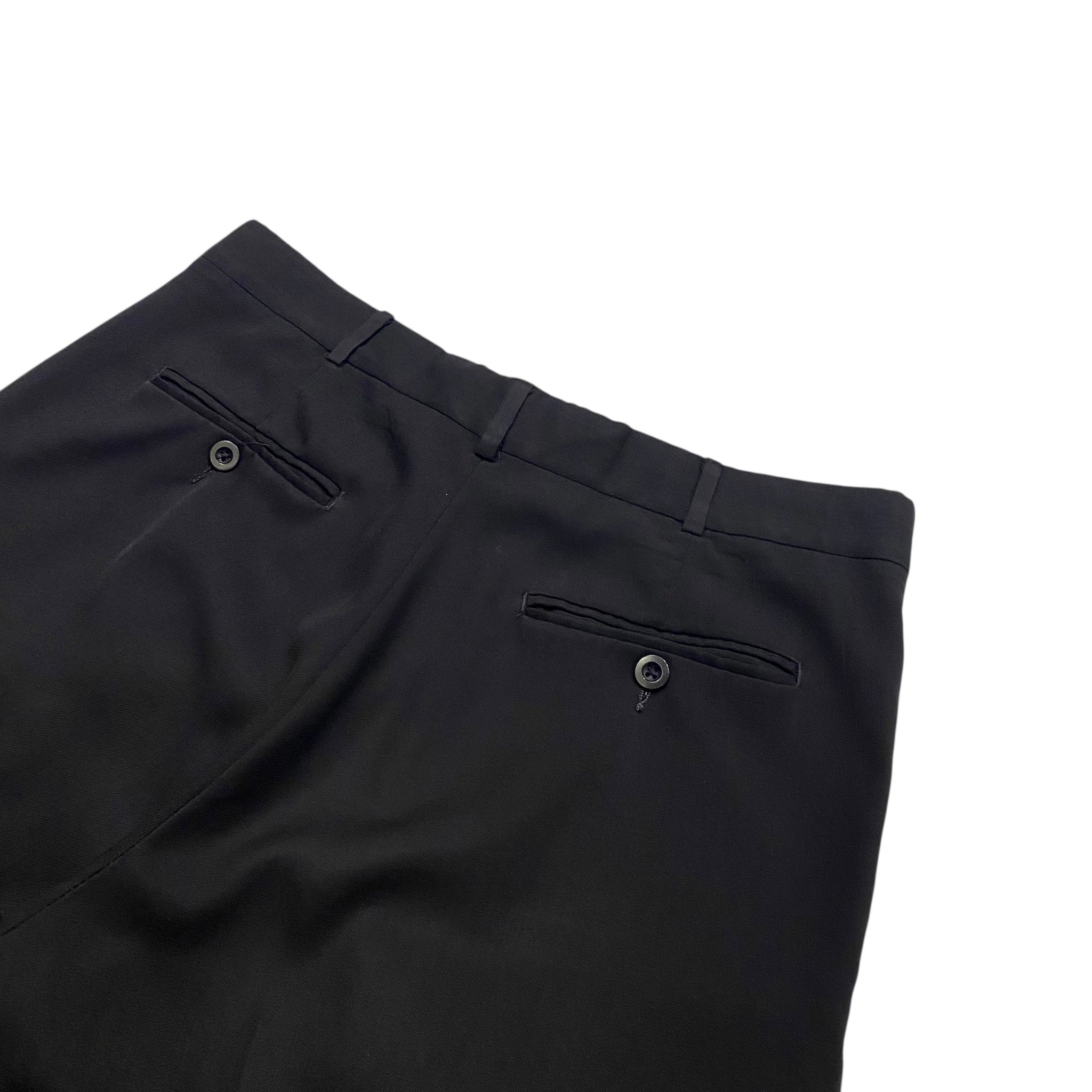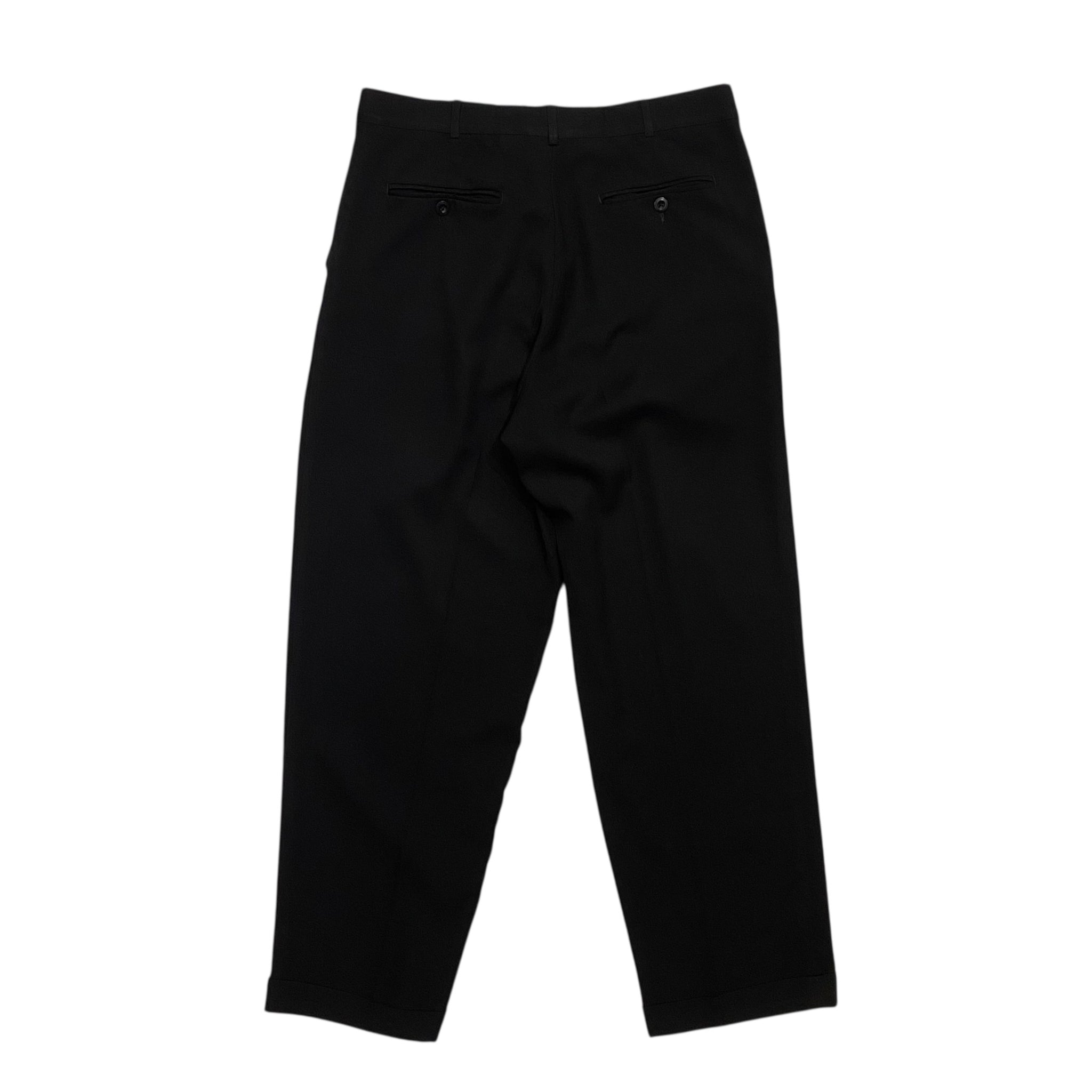 個人的にはこういう綺麗なスラックスにややふざけたグラフィックものやキャラクター系などのトップスを合わせるスタイリングがとても好きです。上が多少やれていてもそれを成立させてくれる頼もしい相棒がブラックの2タックスラックス。